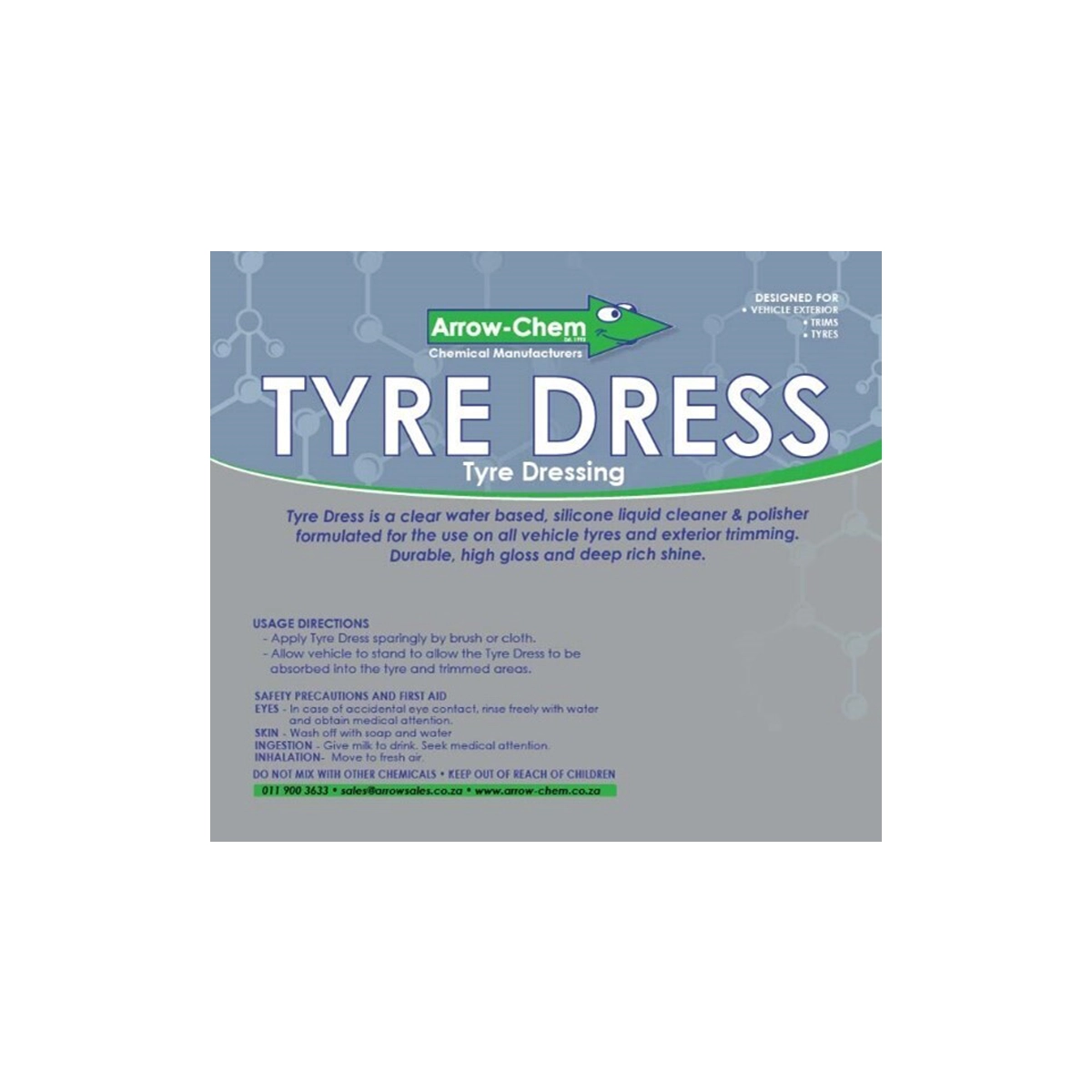 Tyre Dress is a black water based silicone liquid cleaner & polisher formulated for the use on all vehicles’ tyres and exterior trimming.