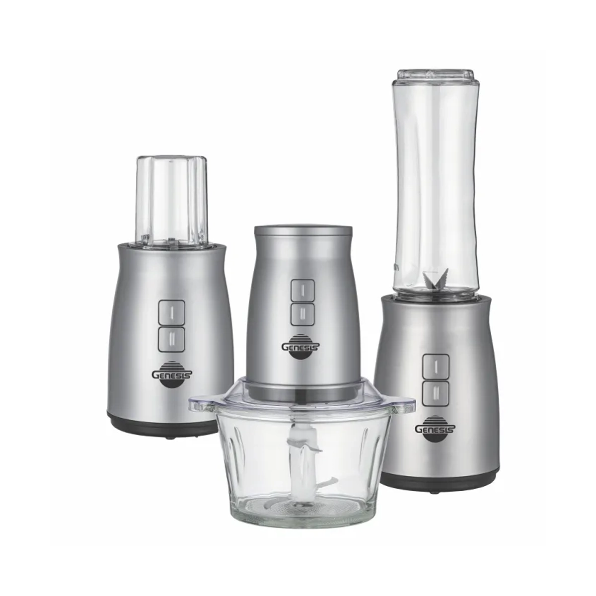 | What’s in the box | 1 x Genesis Kitchen Combo 1 x Head Gear Cover 1 x 2L Glass Food Processing Bowl with Double Layer Stainless Steel Blades 1 x 600ml Blending Bottle with Double Layer Stainless Steel Blades 1 x 100ml Spice Grinding Cup with Double Layer Stainless Steel Blades 1 x Recipe Book |